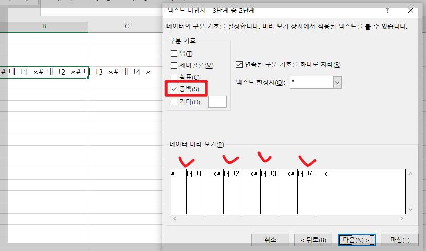 6)각 태그 사이가 공백으로 나누어져 있으므로 "공백" 선택