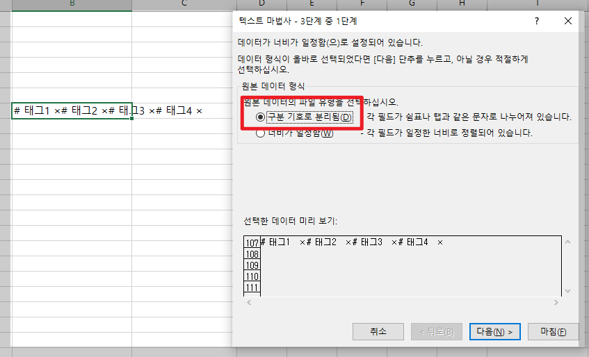 5)"#"과 공백이 있으므로 "구분 기호로 분리됨"을 선택