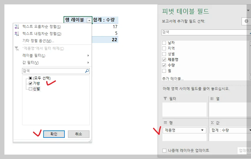 1. 행 필드에 ‘제품명’이 들어갔다면
