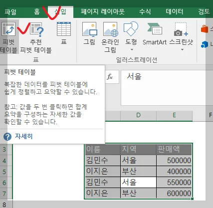 이제 본격적으로 피벗테이블을 만들어볼게요.