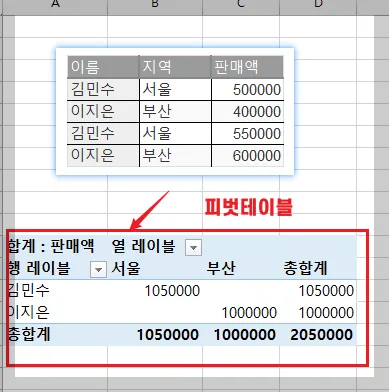 이렇게 하면, 이름별로 지역별 판매액이 자동 계산되어 요약됩니다.