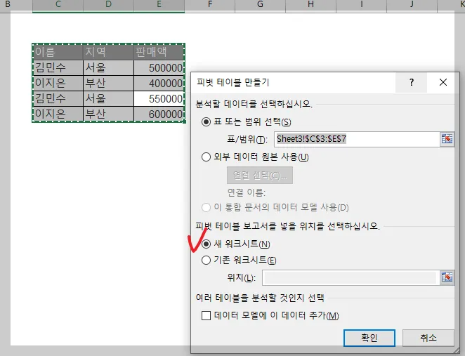 ‘새 워크시트’는 추천드리는 방식으로, 데이터와 분석표를 구분하기 좋습니다.