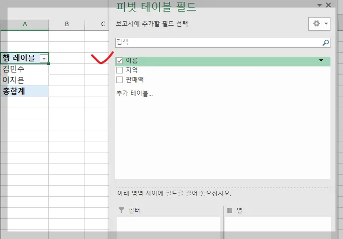 Step 4. 피벗테이블 창이 열리면, 필드 배치하기